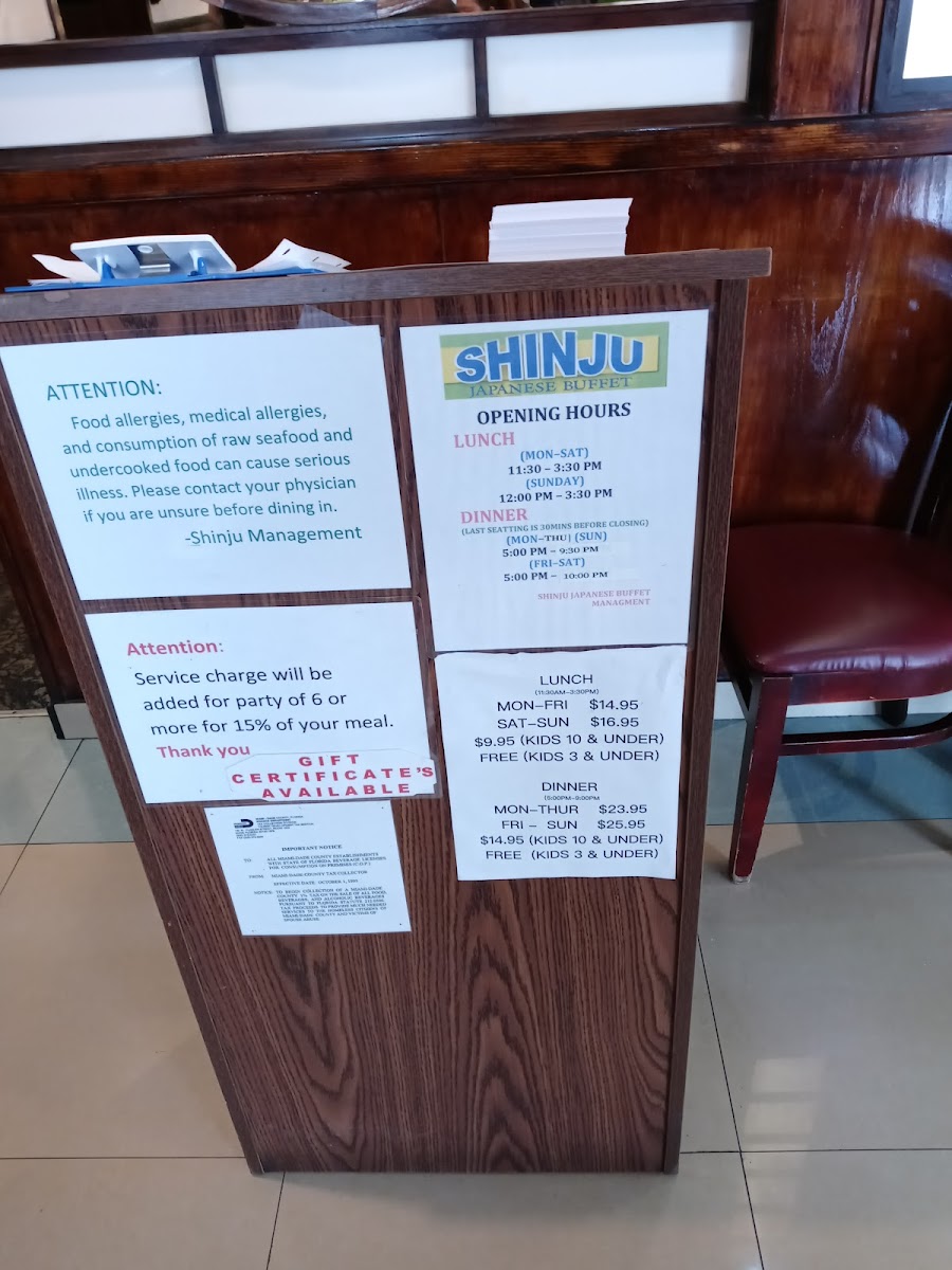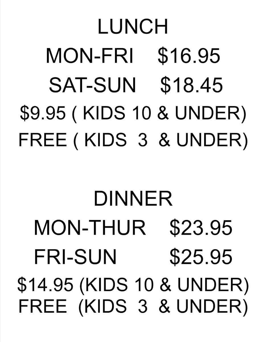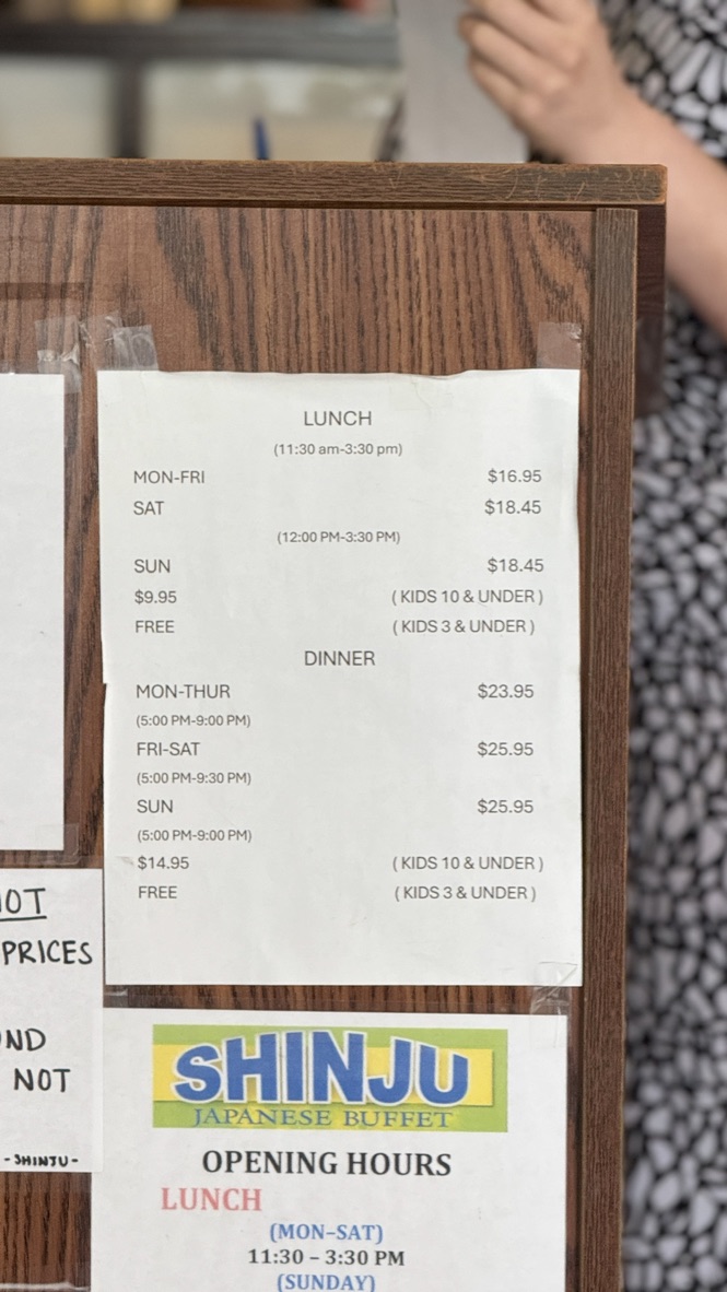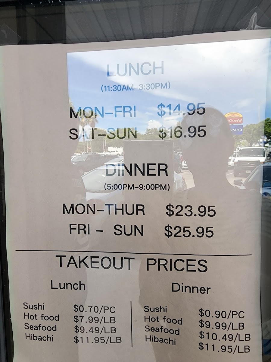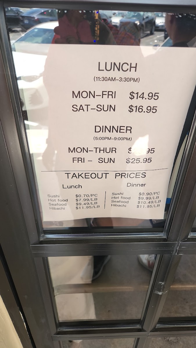 The buffet pricing varies by day and mealtime, with lunch options on weekdays and weekends, and dinner available throughout the week. This menu is designed to accommodate casual dining with an emphasis on variety and self-service, allowing guests to sample a wide range of Japanese dishes in one visit.